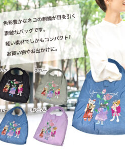 かわいいネコの刺繍がアクセント♪ 軽くて大容量、コンパクトに畳めるエコバッグ!